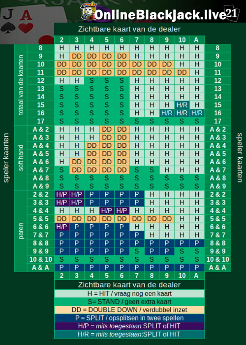 Zoals je misschien al hebt gezien zie je op de blackjack strategie tabel ook nog de letter H/P en H/R. Afhankelijk van de blackjack variant die je speelt is het mogelijk om bij H/P te hitten of te splitsen, en bij H/R te hitten splitsen.